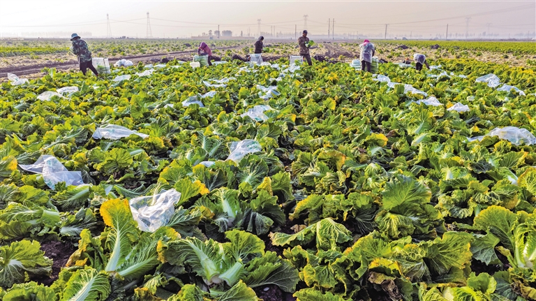 11月15日,河北省唐山市玉田县虹桥镇农民在田间抢收大白菜。为应对寒潮天气,玉田县农民加紧田间大白菜的抢收、外运和防寒工作,保障冬季蔬菜供应。(据新华社报道)