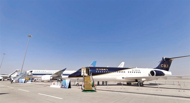在航展现场的静态展示区,中国南方航空的C919飞机和中国商飞的C909公务机同台登场。C919是中国首款按照国际通行适航标准自行研制、具有自主知识产权的喷气式中程干线客机,最大载客174人,最大航程超过5000公里。C919飞机已交付26架,开通30余条航线。C909公务机舱内空间宽敞舒适,提供12~29座配置方案,已向国内外客户交付170余架,开通790余条航线。