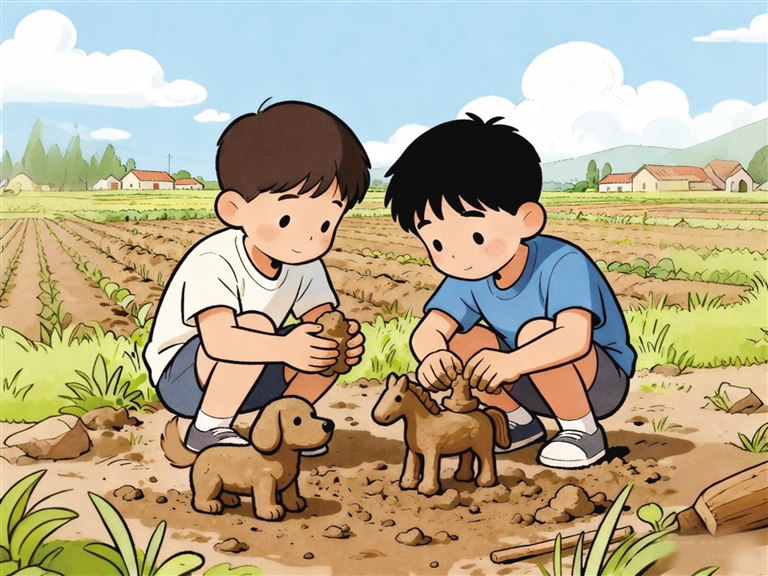 童年时,我没少做这种事。在村头的青石碾盘上,几个伙伴坐在一起,热火朝天地玩泥巴。抟泥模时,我总喜欢效仿别人,看阿三捏了只小狗,我也捏只小狗;看阿四捏支手枪,我把“小狗”揉掉,重新再抟成手枪模样……如此改来改去,最后什么“作品”也没有捏成,手里空攥了一把湿泥巴。有一天,父亲下地时路过村头,看到了我捏泥模的整个过程。回到家后,父亲严厉地对我说:“你玩泥巴,想捏什么就捏什么,干吗老跟着别人屁股后面跑呢?你就不会捏些自己想捏的东西吗?”说着,父亲坐下来,递给我一团湿泥巴:“来,你现在就捏,看能不能捏出你自己喜欢的东西来。”