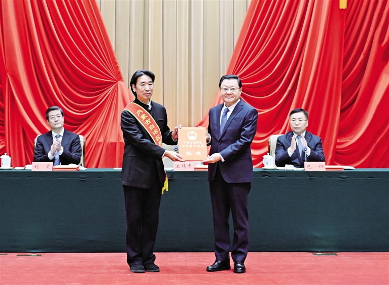 11月27日,自治区党委书记王伟中为科学技术进步特等奖第一完成人张鹏举颁奖。