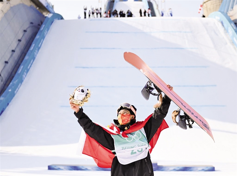 苏翊鸣在2022年冬奥会单板滑雪男子大跳台夺冠后庆祝