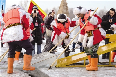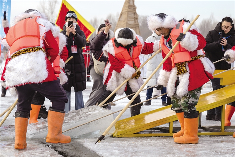 12月7日,在第六届哈尔滨采冰节现场,采冰汉子在采头冰。当日,第六届哈尔滨采冰节在松花江畔开幕,精彩的采冰仪式和民俗体验互动吸引众多市民和游客参与其中,标志“冰城”哈尔滨进入采冰季。摄影/新华社记者 张 涛