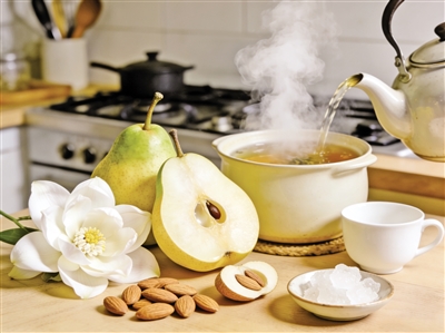 在家可以试着做一款杏梨润肺茶:将一个鸭梨切块,再辅以10克甜杏仁和15克百合,加水煮沸再转小火慢炖20分钟。此茶能生津润燥、止咳平喘,特别适合干咳无痰、咽痛音哑者。