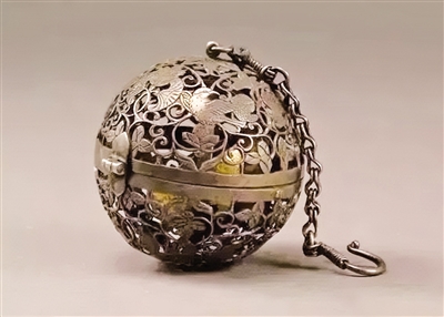 手炉出现的时间与卧褥香炉差不多,一般都是巴掌大小的铜制炉体,根据喜好制成各种形状。只需要在炉体内放入一小条木炭,或是炭火余烬,再盖上有镂空花纹的炉盖,热气就从炉盖的镂空孔洞中散发出来。汉武帝的姐姐平阳公主的墓中就曾出现过一个手炉,可见除了取暖外,手炉也是古人日常的心爱之物。
