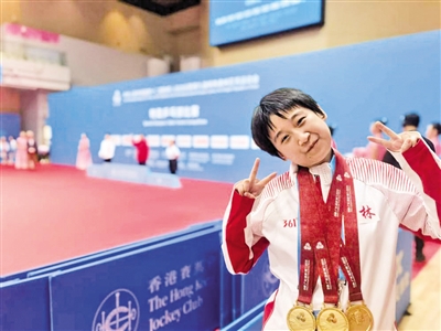 此后,王莹踏上了“收割奖牌”的道路。2016年,她在南京举行的全国特奥乒乓球比赛中摘得女单金牌;2019年,她带病参加天津全国第七届特奥会,斩获2金1铜;2021年陕西全国第八届特奥会,她将混双、女双、女单金牌全部收入囊中,同时拿下团体铜牌。本届残特奥会,她在香港再度收获3金。
