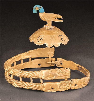 “此冠饰1972年出土于鄂尔多斯市杭锦旗,同批出土了200多件金银器,都有虎、狼、马、羊、鸟等浅浮雕动物形象以及虎咬羊、狼咬羊等咬斗场景,具有鲜明的草原文化特色。”2号展厅策展人沈莎莎介绍,“此冠饰是迄今国内发现的唯一匈奴贵族金冠饰,融铸造、锻压、锤打、抽丝等技术于一身,代表了当时金银器制作工艺的最高水平,在中国艺术史、科技史上具有重要地位。”