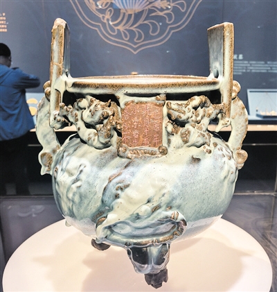 “这件香炉打破了民间‘钧不过尺’的说法,是罕见的钧窑珍品。”4号展厅策展人杜汉超说,“刻有纪年款识的元代钧窑瓷器较少,这件香炉的铭文明确记载了烧制时间与工匠姓氏,为判定器物年代和历史背景提供了可靠依据。”