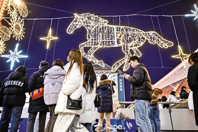 12月20日,行人从北京西单商圈的一处马形象灯饰前经过。随着农历马年的脚步渐近,北京街头巷尾的节日氛围逐渐升温,吸引众多游客游玩观赏。摄影/新华社记者 陈晔华