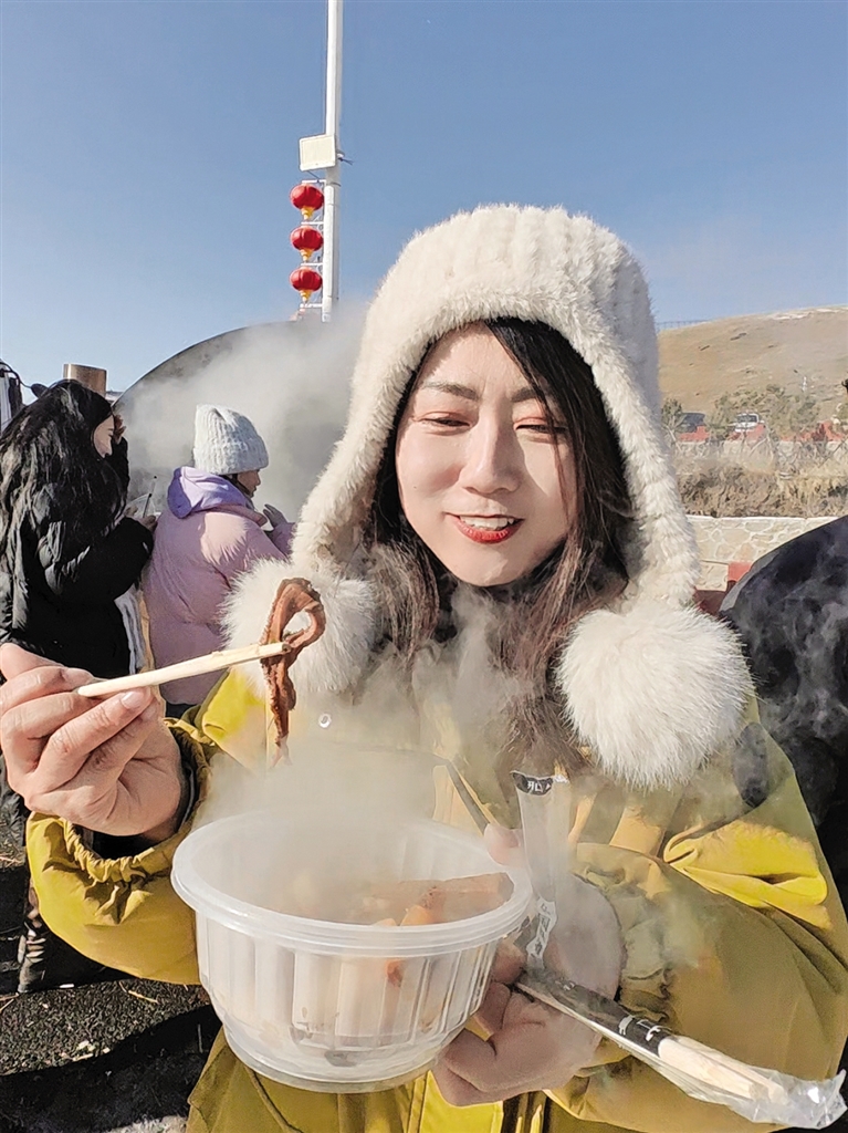 最引人注目的,莫过于现场极具特色的“千人锅羊杂宴”。直径3.6米的铁锅内,羊杂翻滚,热气腾腾,浓郁的香气在寒风中四溢,让人垂涎欲滴。“开吃啦!”随着一声吆喝,早已排成长龙的游客有序上前,工作人员麻利地为大家盛上一碗碗热腾腾的羊杂汤。鲜嫩的羊杂、红亮的辣椒油,配上刚出炉的油炸糕,一口下去,暖意从胃里直窜全身。“不仅能体验冰雪乐趣,还能免费喝上一碗热乎乎的羊杂汤,太贴心了!”来自呼和浩特的游客杨女士高兴地说。