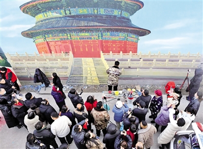 记者见到吴承言的这天下午,他正要给“天安门”墙绘旁边的“天坛”墙绘收尾。只见他穿着袖子沾满颜料的迷彩棉服,把手机固定在手腕上以方便对照造型和颜色,寥寥几笔,便勾勒出“天坛”祈年殿台基上的出水口石雕。