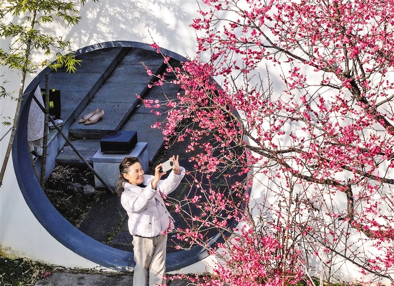 1月15日,在湖北省武汉市东湖梅园,游客拍摄梅花。三九时节,一些地方梅花凌寒绽放。(据新华社报道)