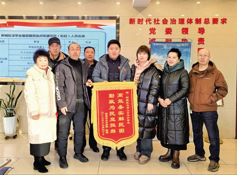新报讯(草原云·北方新报首席记者 王树天) 1月16日,呼和浩特市新城区御景城小区居民代表将一面绣有“高效务实解民困 勤政为民显担当”的锦旗送到大青山街街道办事处,感谢工作人员帮助该小区居民解决用水难问题。 据了解,御景城小区长期使用下新营村自备井供水,随着地下水位下降,井水出现水量锐减、水压不足,甚至水质发褐无法使用的情况,居民日常生活受到严重影响。面对居民的急难愁盼,大青山街街道办事处迅速响应,于2025年7月8日牵头组织专题推进会,联合春华水务集团、新城区住建局、开发商、物业及相关单位现场勘查,紧急敲定“两步走”方案:立即实施临时供水保障,同步启动永久性管网改造。