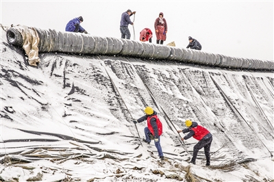 1月19日,在河南省焦作市博爱县孝敬镇博爱源蔬菜专业合作社,辖区供电职工帮助菜农对蔬菜大棚保暖棉被进行维护。为应对近期大范围寒潮和低温雨雪冰冻天气,各地积极采取措施,全力保障人民群众安全温暖过冬。(据新华社报道)