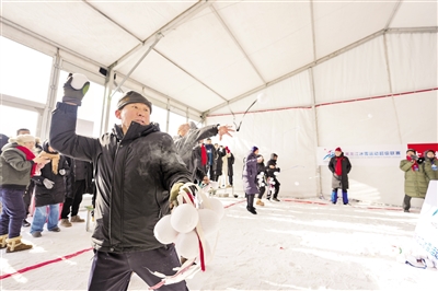 1月20日,参赛选手在比赛中掷“雪球”。当日,黑龙江省“冰超”·上合冰雪体育示范区运动基地2025-2026年民俗冰上体育系列活动(打雪仗赛)在哈尔滨市开幕。场地中线设有“堡垒”掩体,比赛开始后,双方队员从各自半场的“雪球”箱取“雪球”攻击对方,每次只能使用一枚“雪球”,不得越过对方前场线,被直接击中的队员即被淘汰,若常规时间打平则通过“点球”方式决出胜负。摄影/新华社记者 王 松