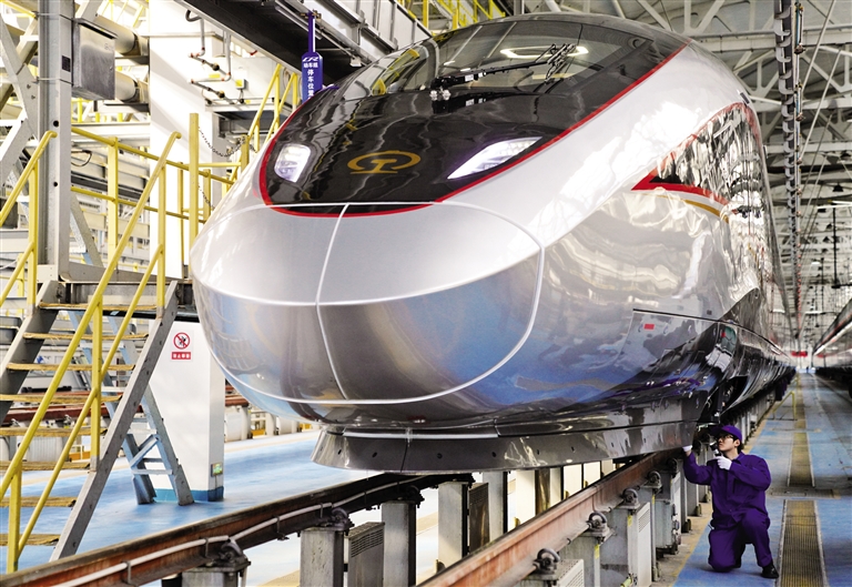 1月20日,中国铁路北京局集团有限公司北京动车段的工作人员在朝阳动车所检修动车组列车。春运临近,中国铁路北京局集团有限公司通过高科技设备加强对动车组司机的模拟实训和动车组列车及轨道线路的检修维护,全力保障旅客平安出行。摄影/新华社记者 李 安