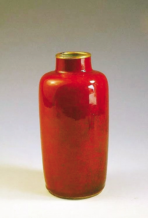 它是冬日插花神器,直口、短颈、丰肩,腹壁像直筒一样直上直下,筒式瓶的名字由此而来。瓶身又像象腿一样敦厚扎实,“象腿瓶”是对它的爱称。瓶口沿镶鎏金铜口,颈肩处转折流畅,腹部丰腴而不失秀美,圈足敦厚稳健。作为一只花瓶,整体古朴大气、气度不凡,尽显端庄典雅。颜色吸睛,釉汁浓稠,色彩鲜艳,于深红中可见不规则牛毛纹,有“明如镜,润如玉,赤如血”的郎窑红特色。