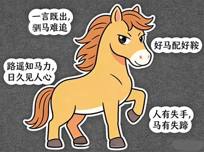 先说一些人们所熟知的。“一言既出,驷马难追”,是指话一旦说出去,很难收回。“路遥知马力,日久见人心”,是说一个人的品性,交往时间长了就知道了。“君子一言,快马一鞭”,是说表达意见要干脆利落,不要拖泥带水。“旗开得胜,马到成功”,常用于对一个人执行某项重大任务前的祝愿。