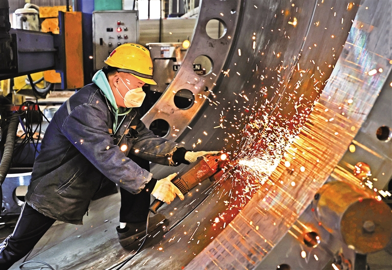 2月24日,在江苏省连云港经济技术开发区重山风电设备公司车间,工人在生产风电塔架。当日是春节假期结束后的第一个工作日,各地企业纷纷开工生产。(据新华社报道)