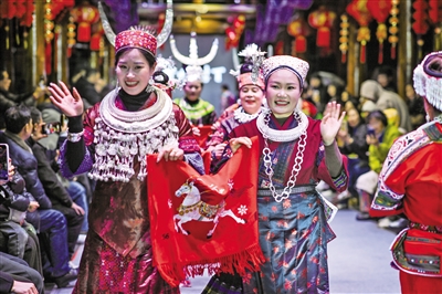 3月8日,绣娘在“村T”舞台展示民族服饰和刺绣。当晚,一场“村T”民族服饰秀在贵州省凯里市苗侗风情园举行。来自黔东南苗族侗族自治州16个县市的绣娘、妇女代表走上T台,展示绚丽多彩的民族服饰之美。 摄影/新华社记者 杨文斌