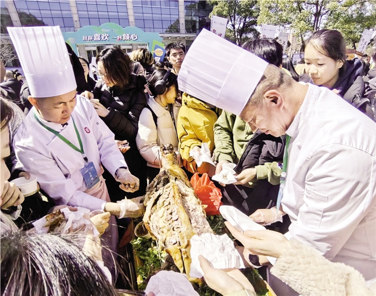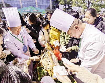 3月10日中午,复旦大学邯郸校区光华楼东侧,一群复旦学生在“包头非遗文创市集”的中央地带簇拥着。 排队的同学们伸长脖子往里张望。两名厨师正手持长刀,从滋滋冒油的烤全羊上片下焦香酥嫩的肉片。“这是烤全羊,内蒙古草原待客的最高礼遇。”青山宾馆的厨师长一边切肉,一边向围观的师生介绍,“我们的羊来自达茂草原,喝的是泉水,吃的是沙葱。”