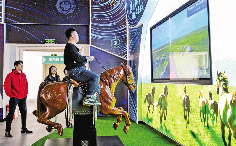 骑马、射箭、剪纸、听戏……3月13日,记者走进内蒙古展览馆三楼,探访刚刚对外开放的“和合共生”——内蒙古非物质文化遗产互动展示馆。这里的非物质文化遗产不再只是陈列参观,而是转化为可感知、可参与、可传播的生活方式,让观众在互动中体悟匠心,在体验中传承精神。 内蒙古非物质文化遗产互动展示馆将数字化展示与沉浸式互动体验有机结合,设计并打造“培根铸魂”“交融汇聚”“守望相助”三大主题展区以及14个互动体验区,通过引入魔法互动墙、全息影像技术、戏剧舞台、VR虚拟现实、高清投影、LED显示、虚拟互动与图像融合等多项前沿数字科技手段,生动展示内蒙古丰富多彩的非物质文化遗产项目。