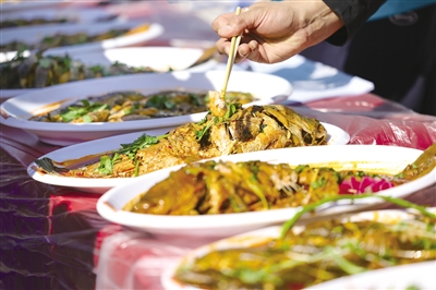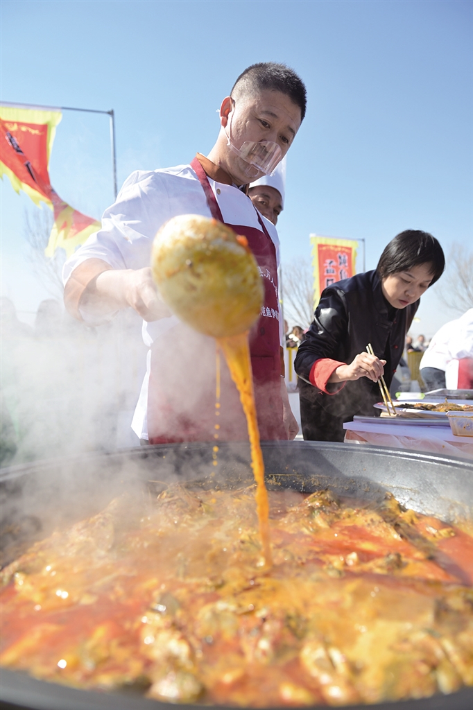 “寻味托县·万人尝鲜”非遗炖鱼争霸赛同步开赛,10家农家乐大厨及非遗传承人同台竞技,用黄河开河鱼搭配托县特色调料慢火炖制。赛场旁,八口大锅组成的“神泉第一锅”烹煮3000斤鲜鱼供游客免费品尝,争霸赛成品也纳入免费品尝环节,托克托县总工会提供全套物资支持。
