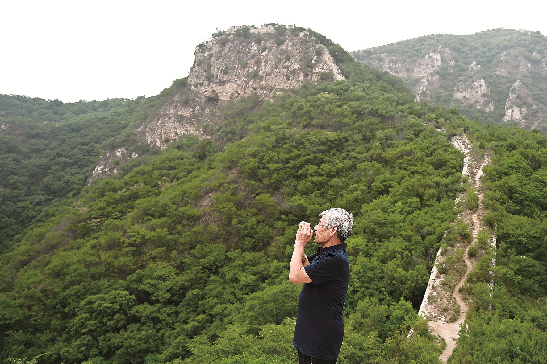 登上石峡关长城,80岁高龄的石峡村村民梅景田对着山谷放声呼喊。