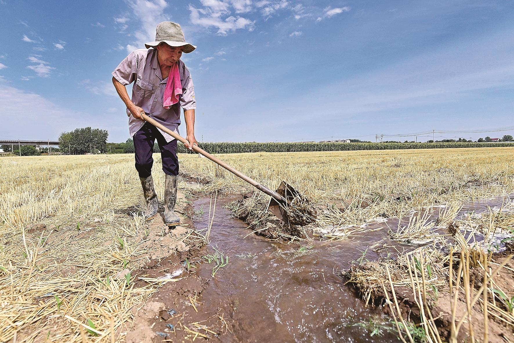 6月16日,山东省青州市黄楼街道孙家村农民在田地里抽水浇灌。