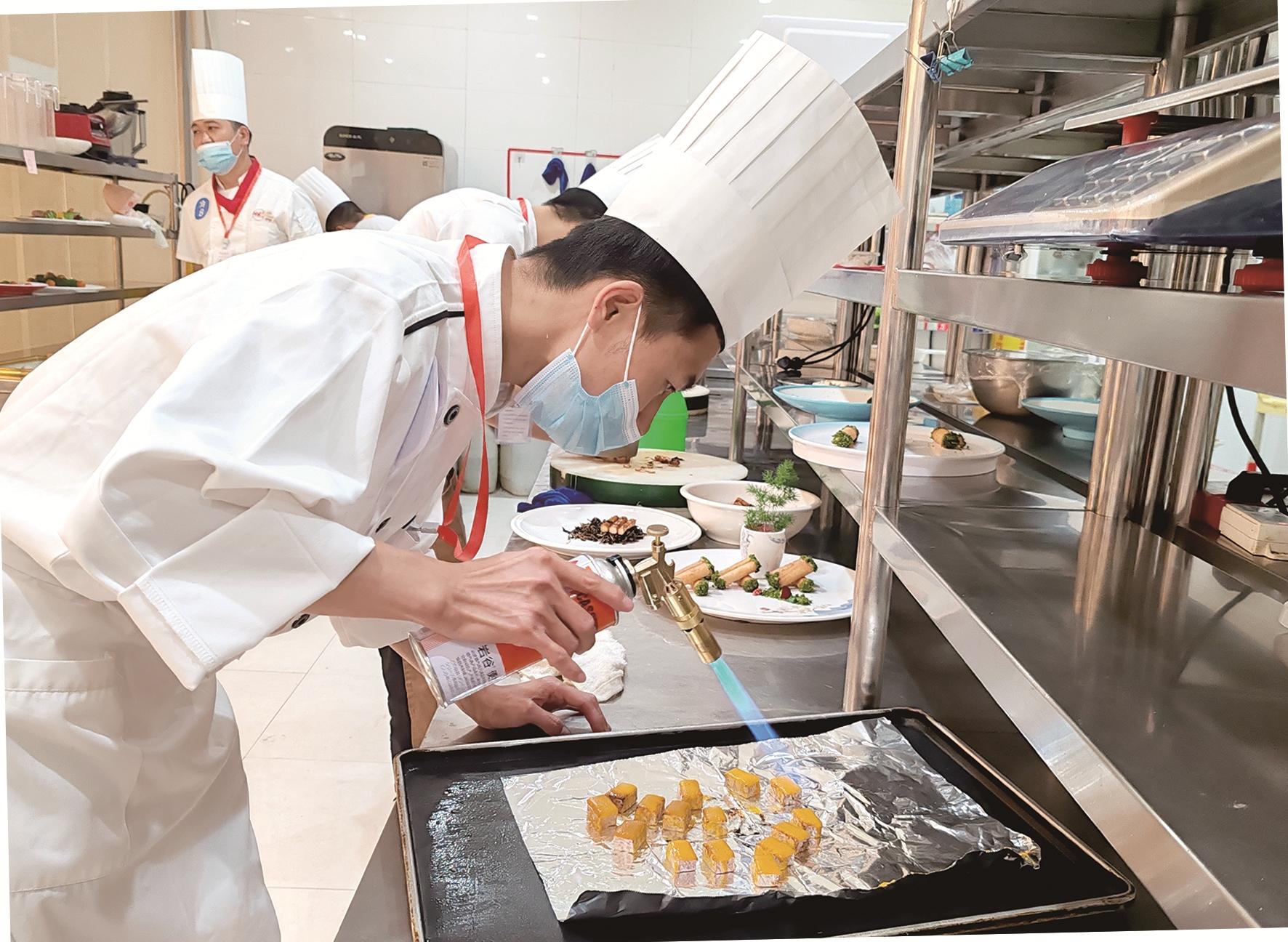这是一场速度与质量的较量,视觉与味觉的碰撞,脑力与技能的比拼,来自9家企业38名选手参赛。一把菜刀,一块菜板,一条围裙,一方天地。面点区,象形山药、象形玉米、象形红枣等形象呈现了一派五谷丰登、硕果累累的景象;冷拼区,形状变幻,花瓣褶皱的纹理清晰可见;“哒哒哒”,刀具与砧板之间快速而均匀的碰撞声,一盘金桔鹅肝做好了。比赛特色鲜明,构思别出心裁,菜品构思新颖,选手们沉着稳定,拼手艺展绝活,精雕细琢展现工匠精神。经过几个小时的角逐,57道色香味俱佳的参赛菜品一一呈现。专业评委团对选手们的作品进行细致点评,从美感、味感、菜品创意等方面认真品评、现场打分。