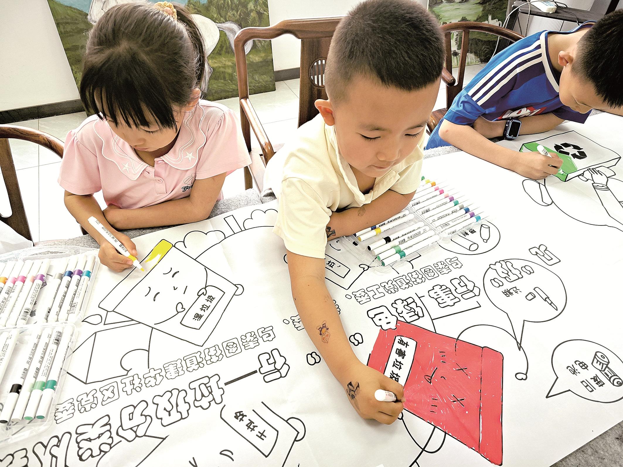“可回收物垃圾桶是蓝色的,厨余垃圾桶是绿色的。”活动中,志愿者用通俗易懂的语言,向小朋友们讲解了垃圾分类的好处,并鼓励他们通过“小手拉大手”,带动大人一起养成垃圾分类的习惯。小朋友们围坐在画布旁,按照画布上的图案,绘出心中的颜色。一幅幅栩栩如生的画面逐一呈现,长长的白色画卷变成了一件色彩斑斓的艺术品。