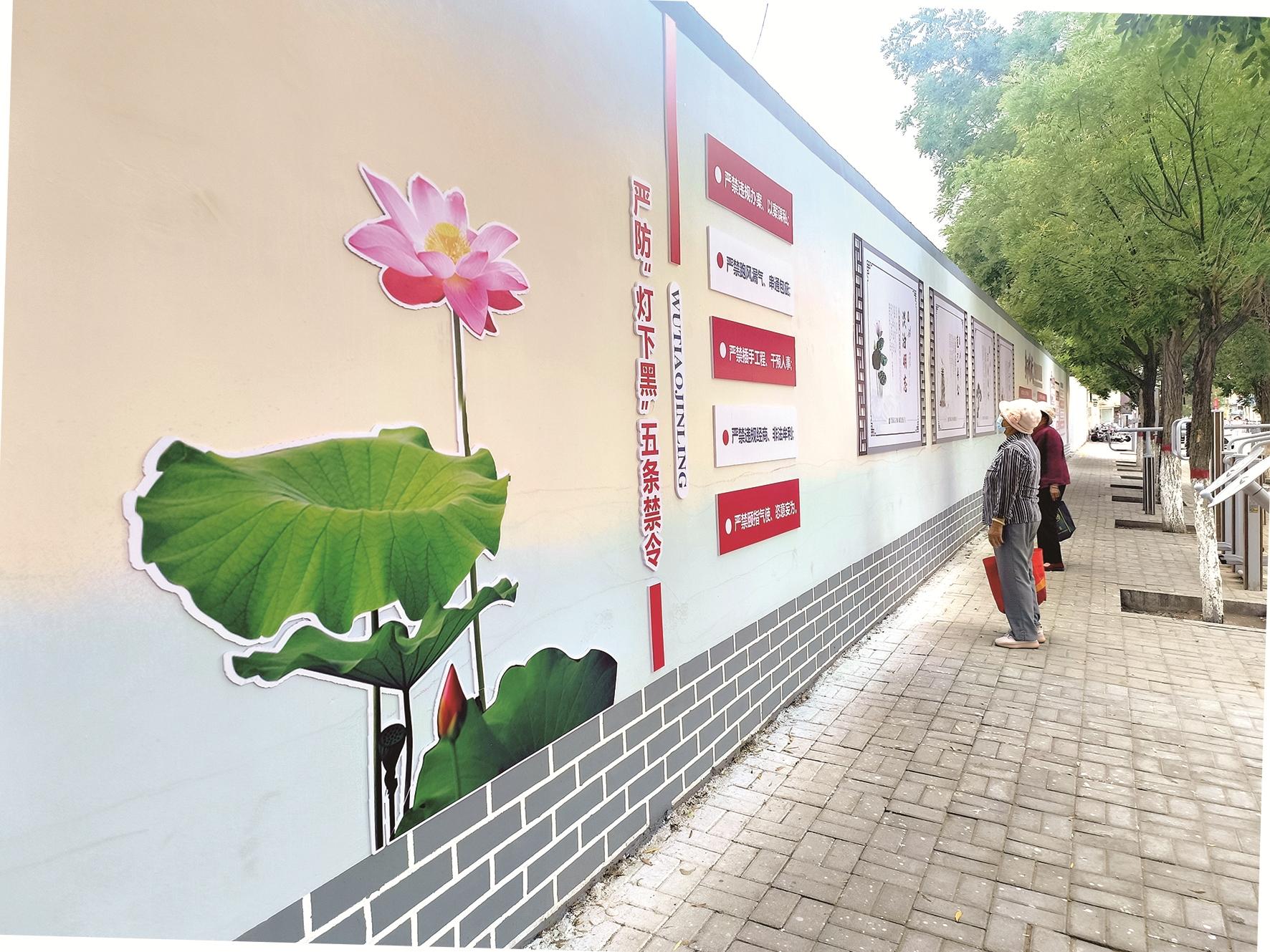 今年,富饶社区对原来的廉政文化墙进行改造升级,建成了长约40米、总面积约120平方米的党风廉政文化墙。一幅幅逼真的莲花图案、一条条警句格言以更贴近实际、贴近百姓的方式融入居民生活,成为集思想性、观赏性、艺术性、教育性于一体的廉政廉洁文化教育宣传阵地。“淡泊明志”“克己奉公”“洁身自好”“严于律己”等内容一一呈现,通俗易懂的廉政警句格言、小故事等廉政文化知识图文并茂地展现在宣传墙上,吸引过往居民驻足观看。