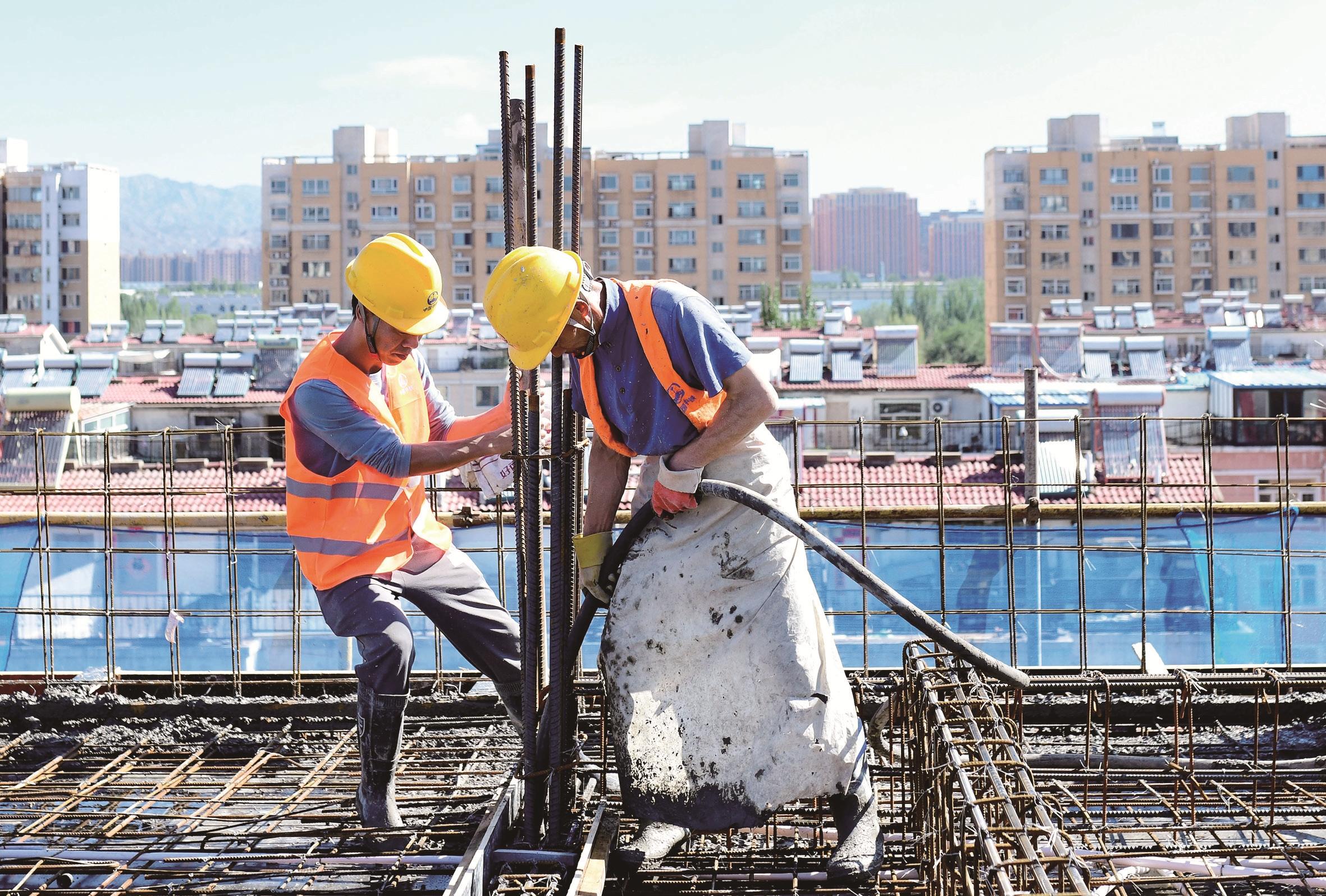 6月29日,建设者在包头市六合成“夹心房”改造项目施工现场进行封顶作业。新华社发(王正 摄)