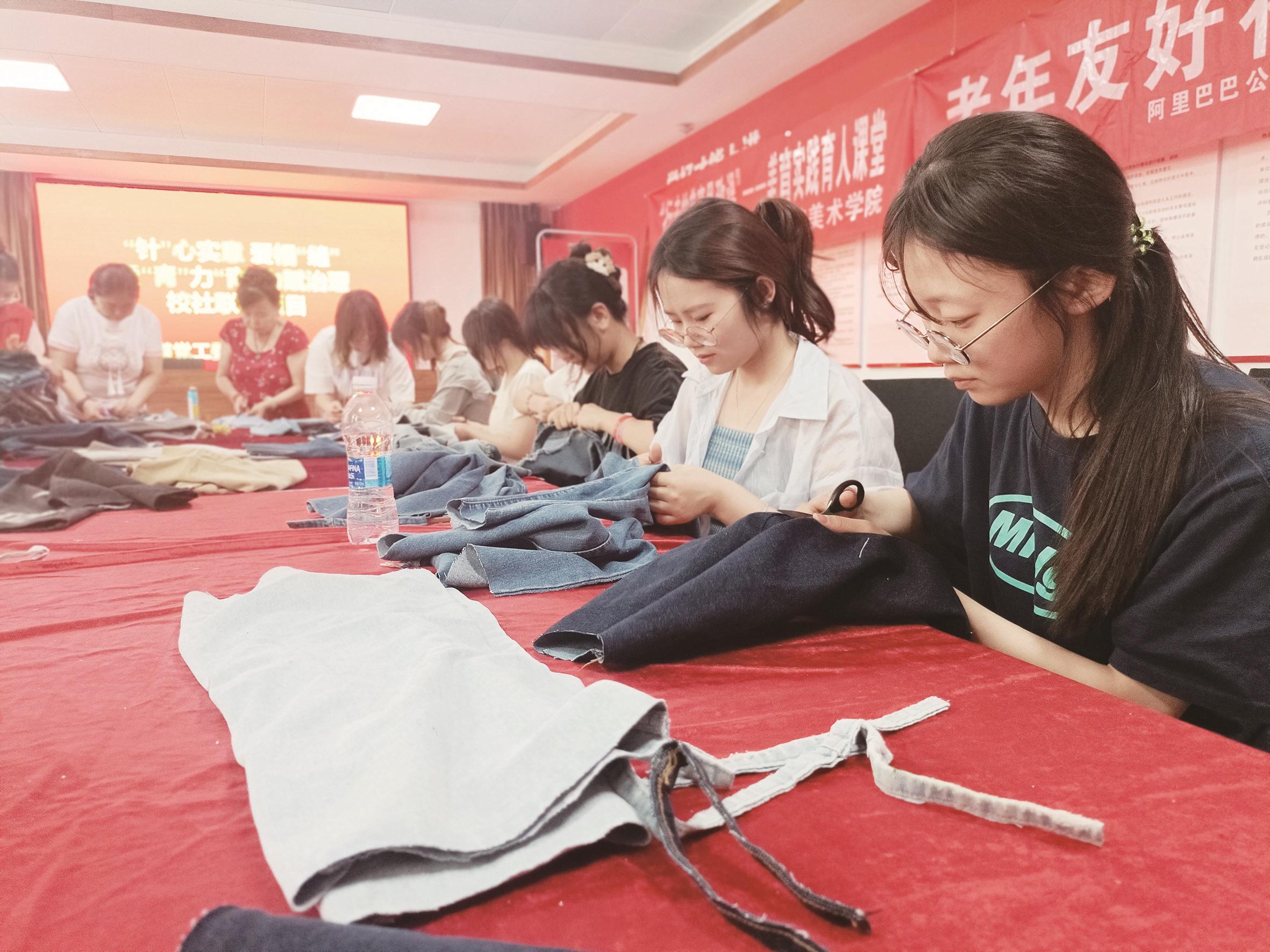 包师院美术学院的学生迅速响应活动号召,4天时间就搜集到首批25条旧牛仔裤。活动当日,社区邀请10位辖区居民与美术学院学生代表共同展开整理、规范裁剪,一起商讨设计爱心图标。弘仁社工的小伙伴们也忙前忙后,协助居民阿姨们递剪刀、压裤边,整个现场热闹而有序。