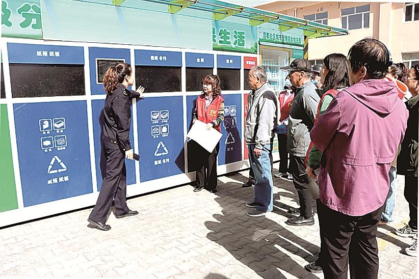 执法人员和社区网格员还通过入户走访,重点了解居民对垃圾分类的习惯性,为他们详细讲解了如何辨别各类垃圾并进行分类、如何处理有害垃圾等相关问题,让居民从自身做起,并努力带动家人、朋友,自觉坚持垃圾分类。图为工作人员向居民讲解垃圾分类设施。