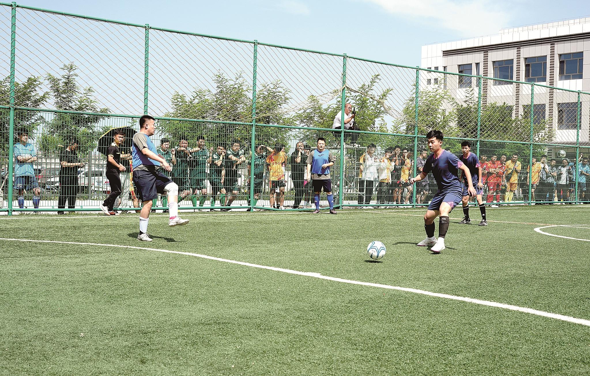 “今年固阳县足球比赛报名的队伍比去年多8支代表队,参赛人数增加了2倍。通过组织这样的比赛,希望能让更多的足球爱好者参与进来,为广大干部职工群众提供一个感受足球魅力、挥洒拼搏激情的平台,带动固阳足球事业的发展。”固阳县足球协会秘书长史民华表示。图为运动员带球进攻中。