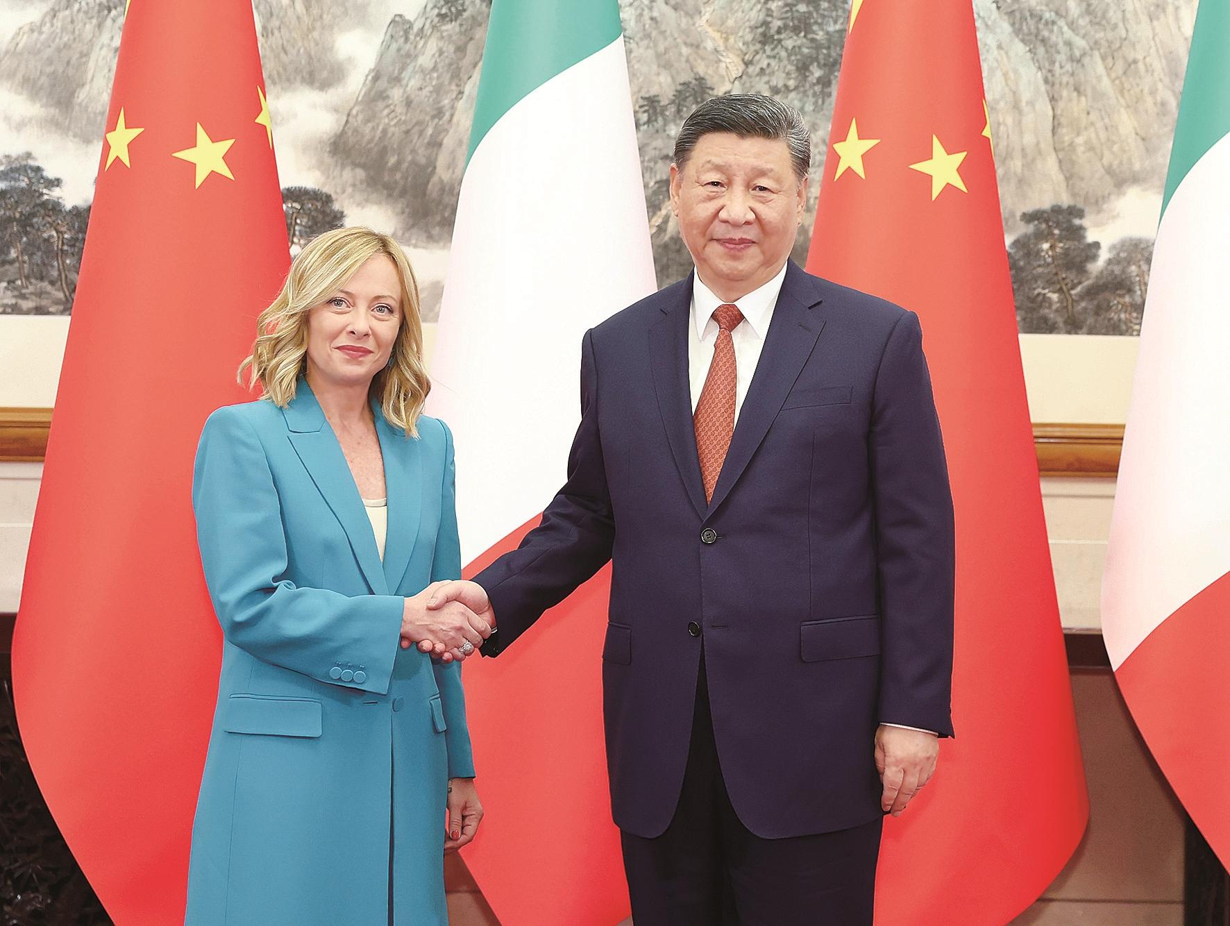 习近平指出,中国和意大利分处古丝绸之路两端,两国历史悠久的友好交往曾为东西方文明交流互鉴和人类社会发展进步作出重要贡献,以和平合作、开放包容、互学互鉴、互利共赢为核心的丝路精神是中意两国的共同财富。当前,世界百年变局加速演进,各国相通、团结则共进,封闭、分裂则各退。中意两国要秉持和弘扬丝路精神,从历史维度、战略高度和长远角度看待和发展双边关系,推动中意关系行稳致远。