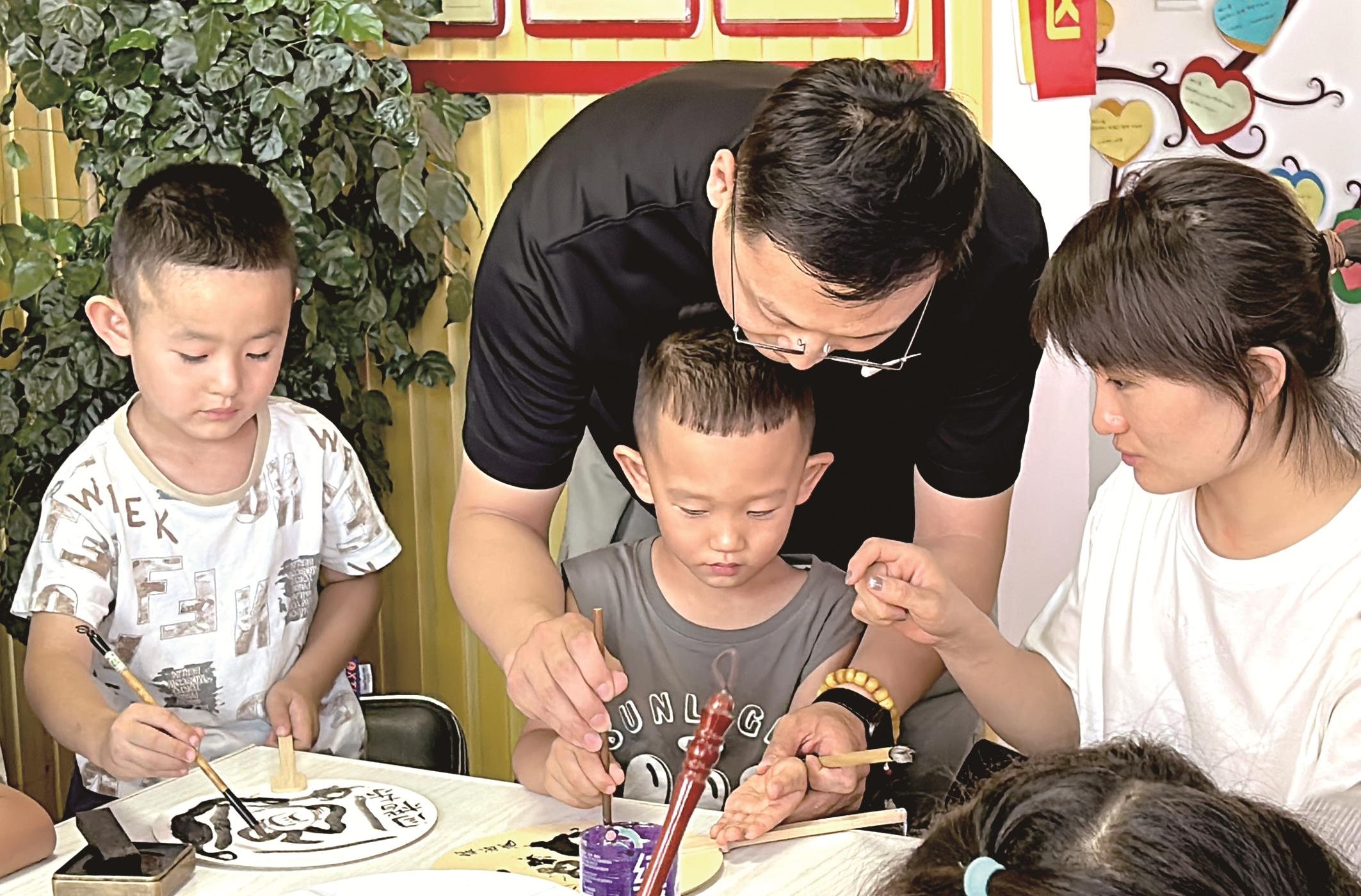 图为老师在指导孩子在扇面上进行彩绘。