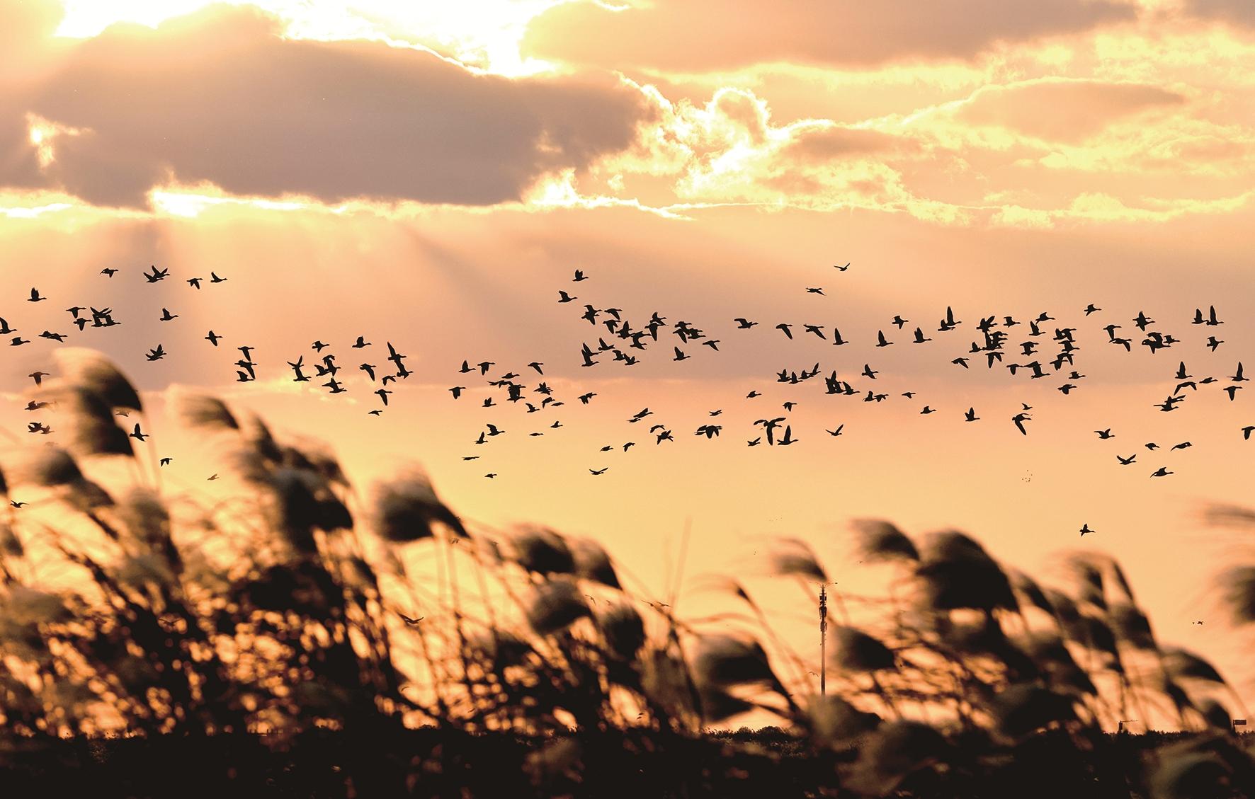 在位于山东省东营市的黄河三角洲国家级自然保护区,越冬候鸟在飞翔。