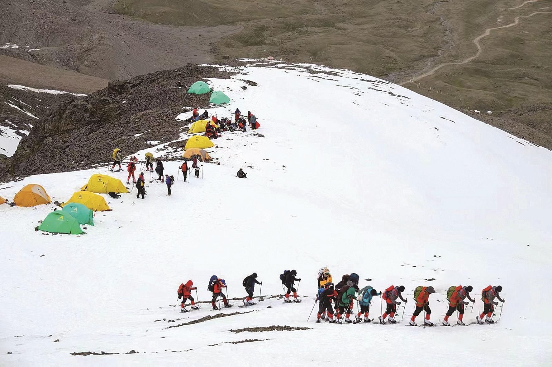 整个登顶过程需要从海拔4350米的大本营,攀登到海拔7546米的顶峰,爬升高度达到3000米。踏在冰凉坚硬的石头上,每一步都很艰难,但回头看着脚下走过的路,心情又开阔许多。这次攀登历时18天,在正式攀登之前,要经过三次拉练。