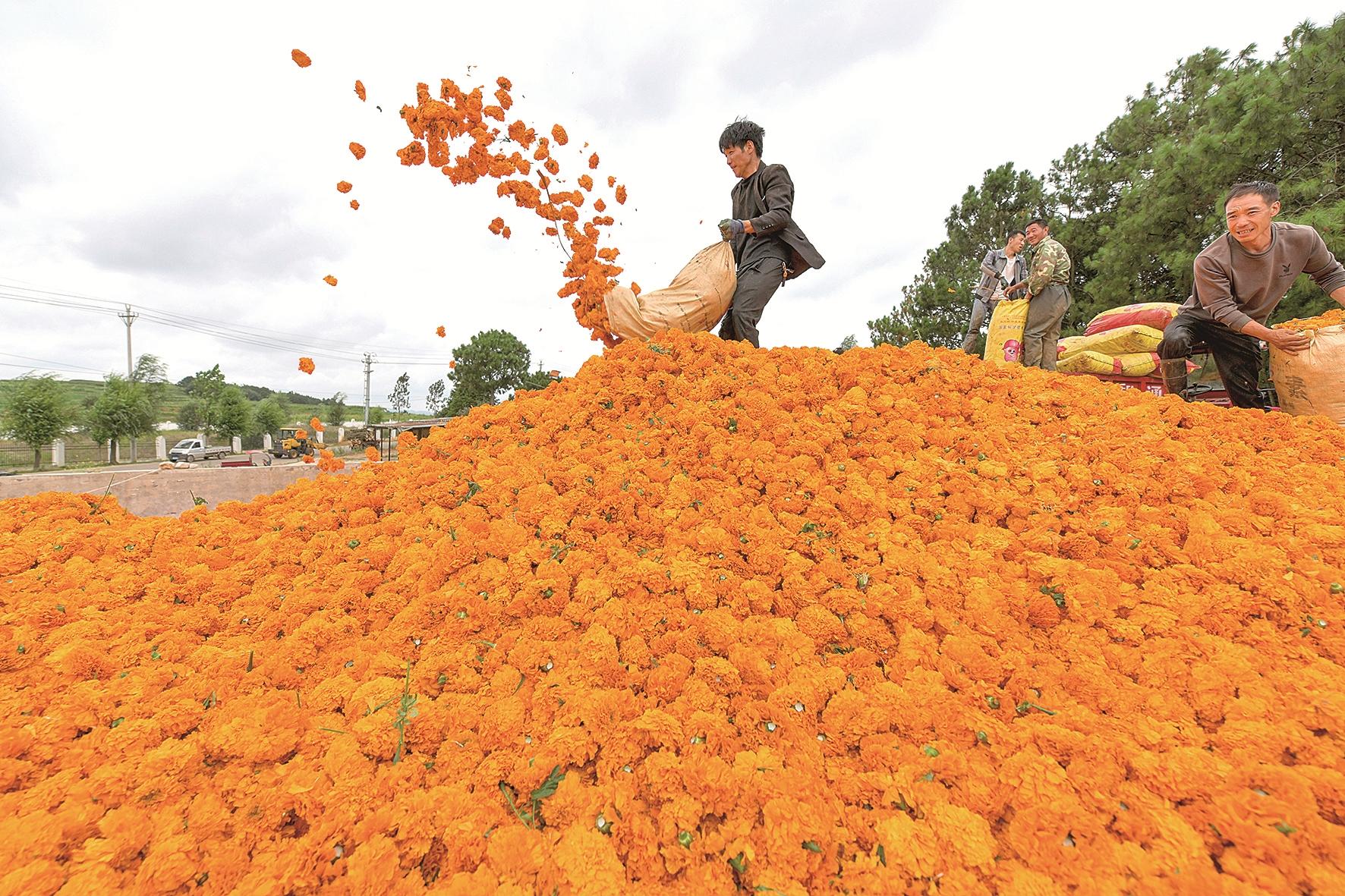 近日,贵州省威宁彝族回族苗族自治县种植的5000余亩万寿菊迎来盛花期,农户忙着采摘、搬运、出售万寿菊。当地种植合作社与制药企业达成“订单销售”协议,采取“公司+基地+农户”的模式发展万寿菊种植业,带动农户增收致富。