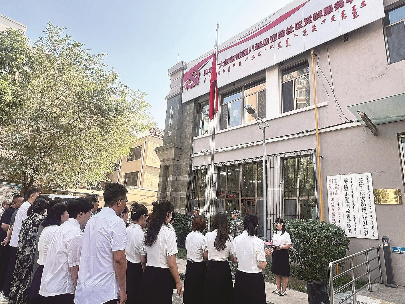 为庆祝中国人民解放军建军97周年,弘扬爱国主义精神,增强社区居民的国防意识和集体荣誉感,8月1日一早,昆区阿尔丁街道团八新星壹品社区党委举行了庆八一升国旗仪式活动。昆区统计局机关党支部、社区党员、退伍军人、青少年、志愿者及社区工作人员参加了此次活动。