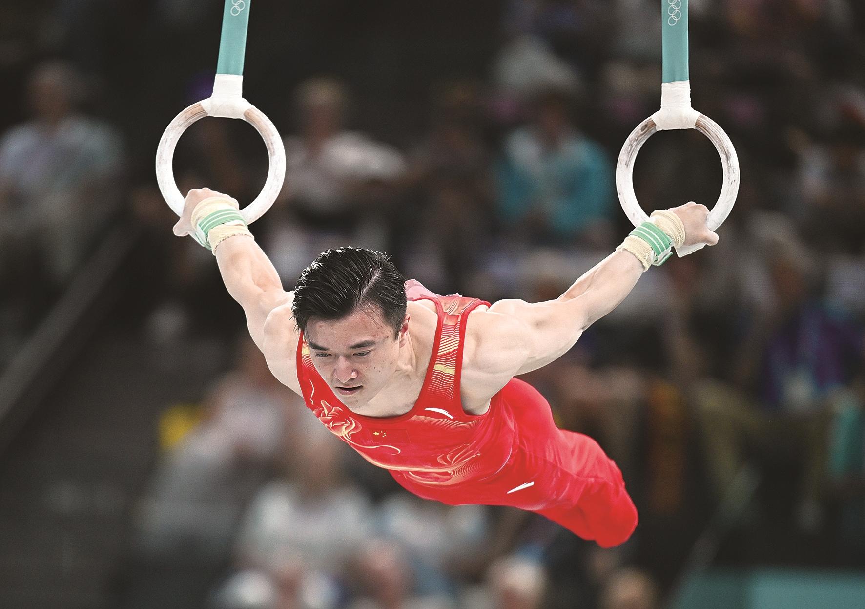 8月4日,中国选手刘洋在比赛中。当日,在巴黎奥运会体操男子吊环决赛中,刘洋夺得冠军。新华社记者 程敏 摄