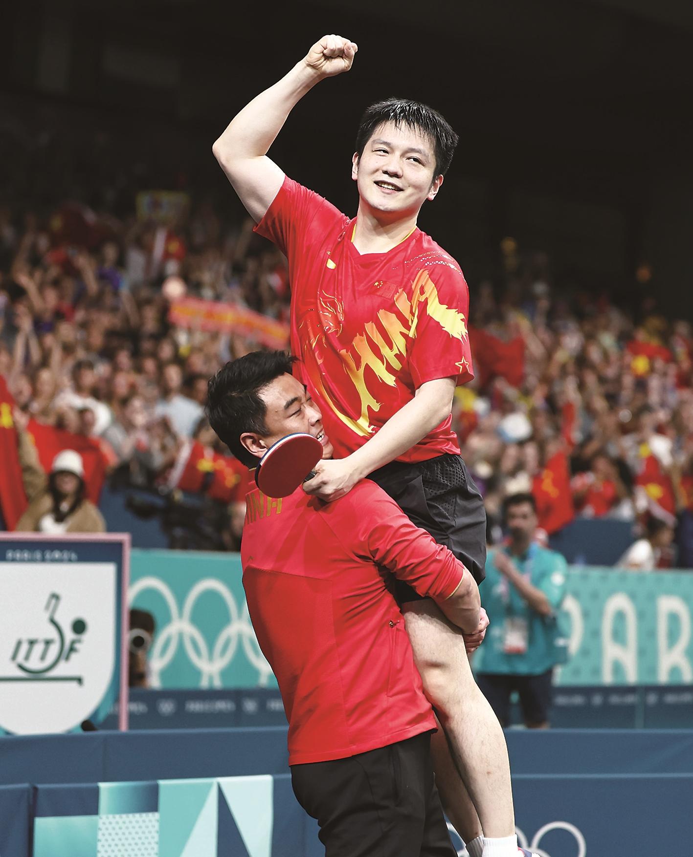 8月4日,樊振东(上)与教练王皓庆祝胜利。 当日,在巴黎奥运会乒乓球男单决赛中,中国选手樊振东4比1战胜瑞典选手莫雷高德,夺得金牌。新华社记者 王东震 摄