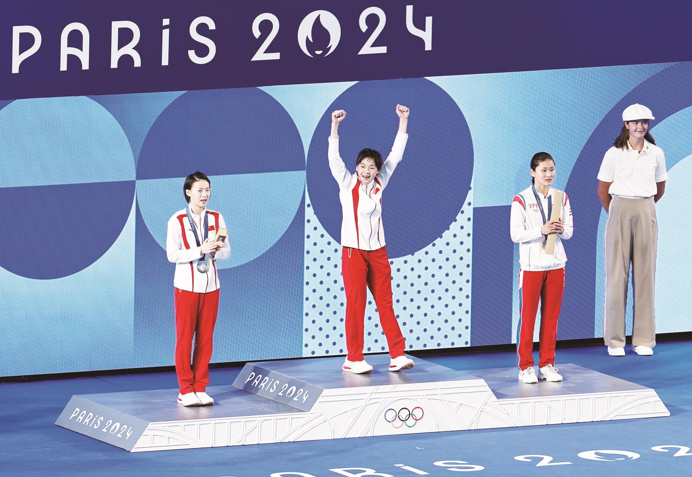 8月6日,冠军中国选手全红婵(前中)、亚军中国选手陈芋汐(前左)、季军朝鲜选手金姬燕(前右)在颁奖仪式上。 当日,巴黎奥运会跳水项目女子10米跳台决赛在巴黎奥林匹克水上运动中心举行。 新华社记者 张玉薇 摄
