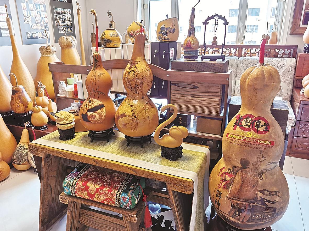 为何喜欢在葫芦上作画? “葫芦代表着福禄之意,葫芦烙画就是在葫芦表面用烙笔绘出或深或浅的褐色图案,形成一幅独特的画作。通过勾、勒、点、染、擦、白描等艺术手法,给人以古朴典雅、回味无穷的艺术享受。”杨炳学介绍,研读大学课程的同时,杨炳学从最早使用简陋的烙铁工具更换成有20多个笔头的烙画机作画,这样画出的作品更加细腻生动有灵魂。毕业后,她又通过各种线上线下等渠道联系天津山东等地的烙画大师请教学习探讨。“吸取别人的优点,弥补自己的不足,慢慢研究出一些具有自己独特风格的特有烙画技巧。”这是杨炳学的经验之谈。