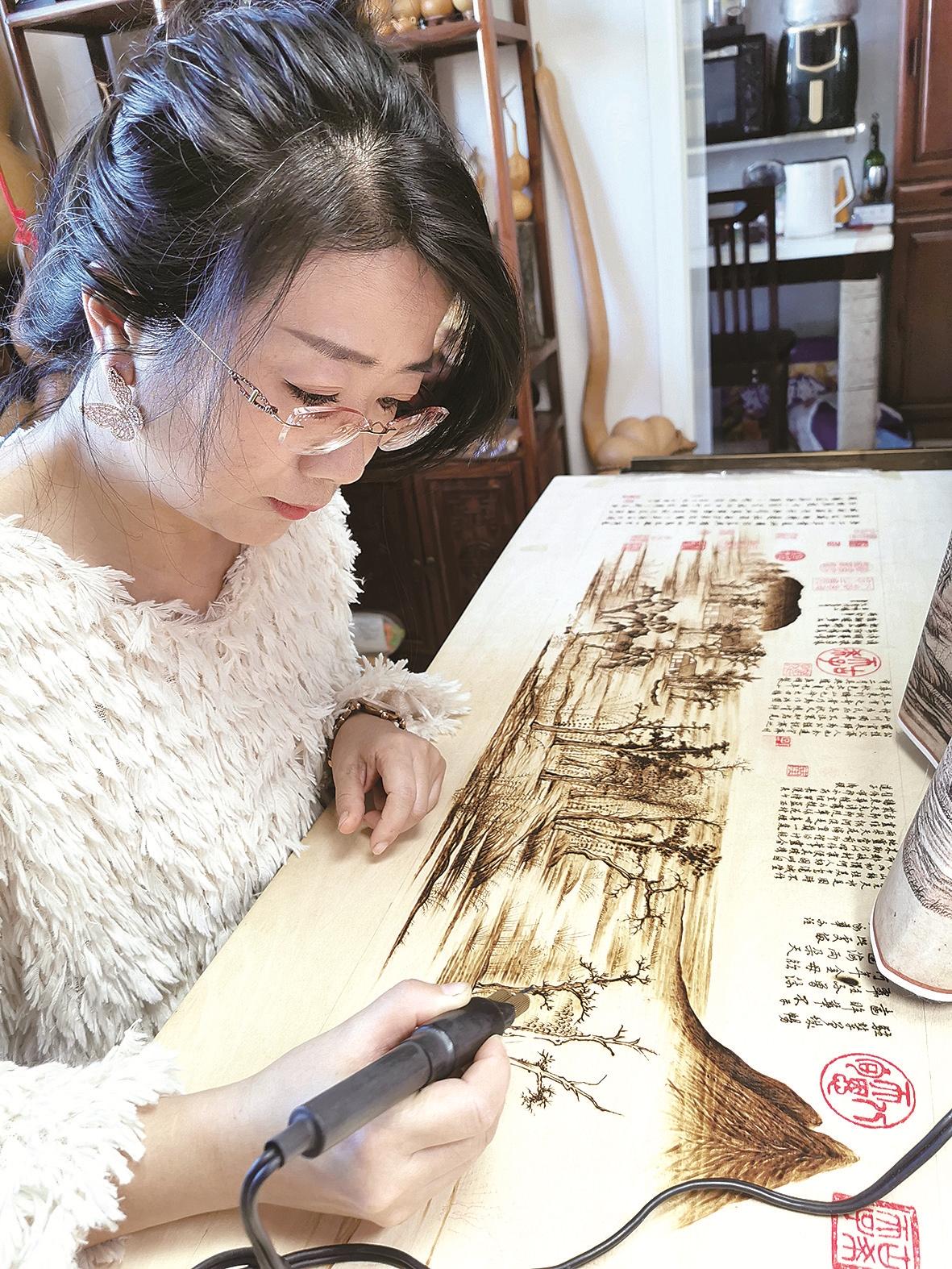 谈及与烙画的结缘,杨炳学一边作画一边向记者娓娓道来。“五岁那年,父母带我和姐姐回县里老家,无意中看到五姥爷拿着烙铁在柜子上烫画,瞬间被他娴熟的动作和高超的技法所吸引。”意在笔先、落笔成型,是当时老人创作时的真实写照,他完全不用打铅笔稿,直接拿烙铁去作画,这在年幼的杨炳学眼里实在是太神奇了。临别时,姥爷送给杨炳学一个小葫芦,并在上面用烙铁烫上“好好学习、天天向上”几个字。小葫芦让杨炳学爱不释手,从此她决定跟五姥爷学习烙画技艺。