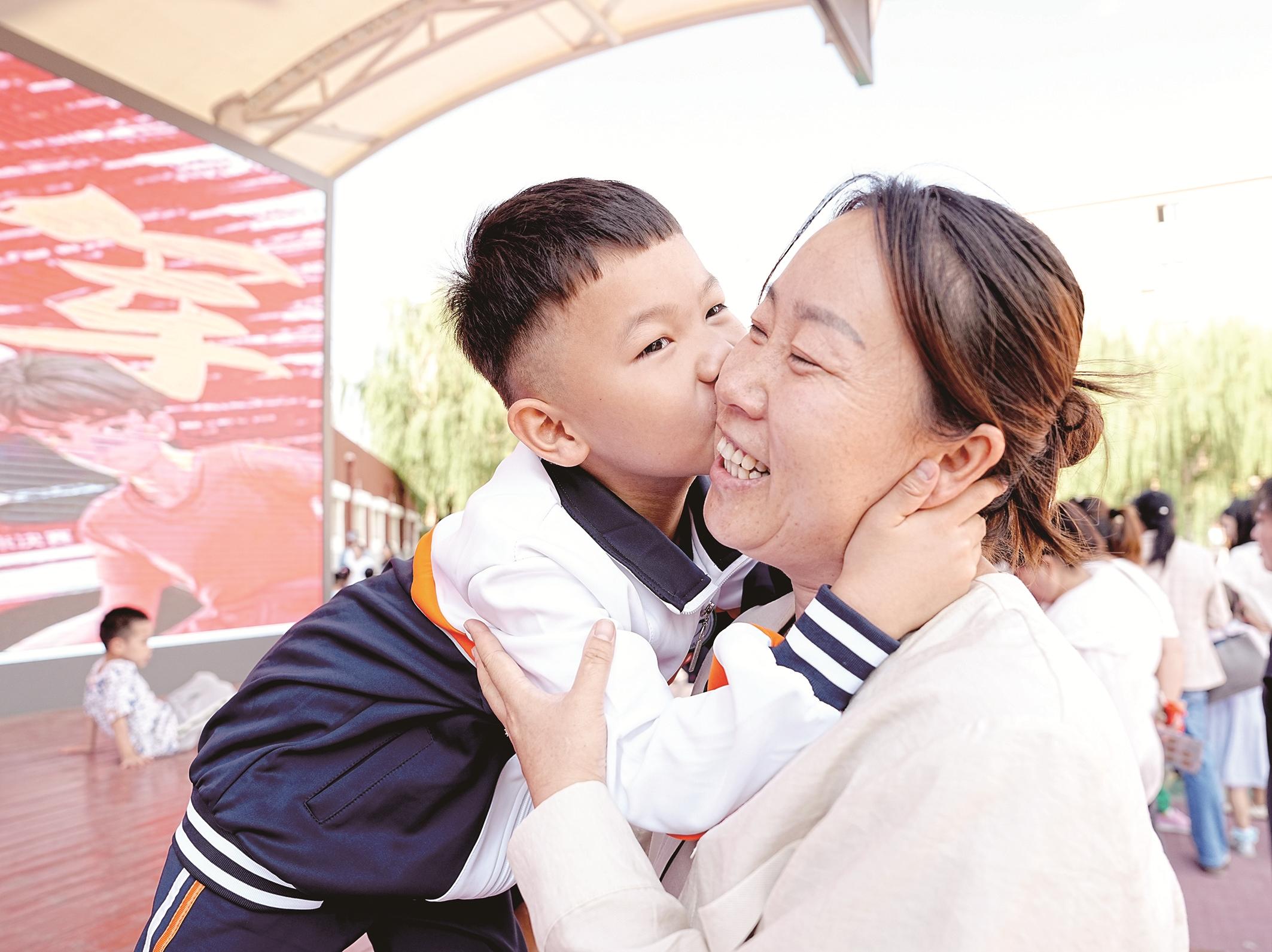 刚刚穿上新校服的一年级新生亲吻妈妈。