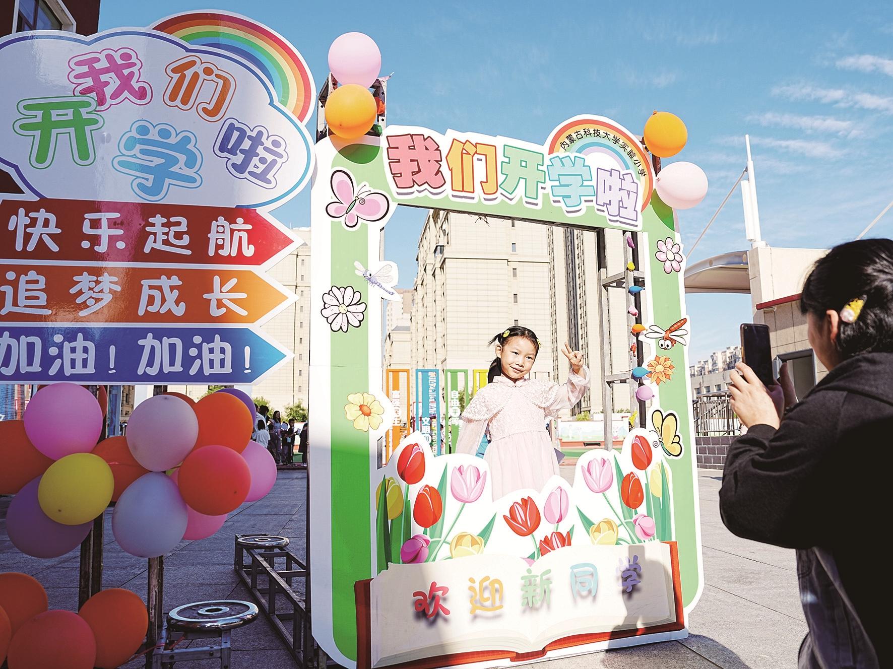“欢迎你,新同学!”迎着清晨的阳光,内蒙古科技大学实验小学的老师们站在校门口,欢迎入学的一年级新生,并为他们每人送上一本涵盖学校介绍的“成长手册”。在2024年秋季开学之际,为营造浓厚的开学氛围,表达对新生入学的热烈欢迎,激发他们成为小学生的自豪感,该校特意举办了一场具有独特仪式感的迎新活动——缤纷课程秀、梦想舞台秀、“章”显精彩秀……一年级新生和家长们在感受校园环境和文化的同时,也对未来充满了期待。