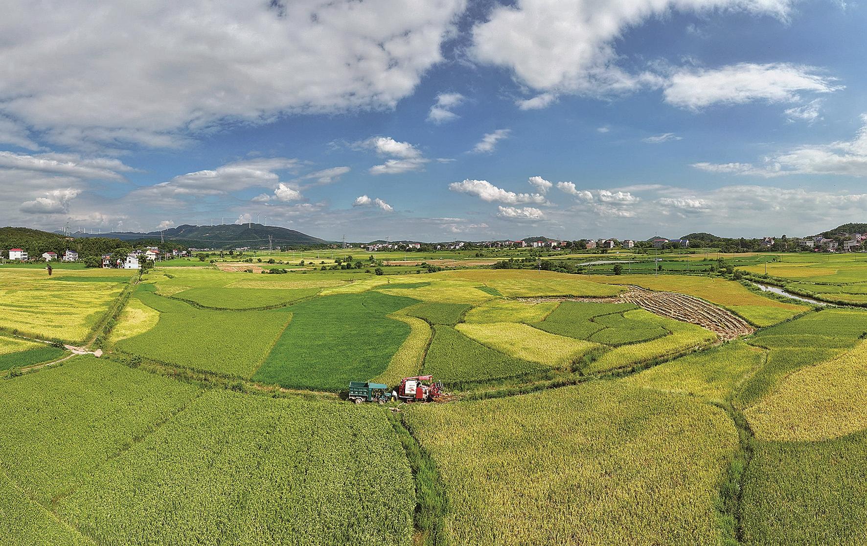 8月28日,在湖南省衡阳市衡东县石滩乡,当地村民驾驶农机收割稻谷(无人机照片)。