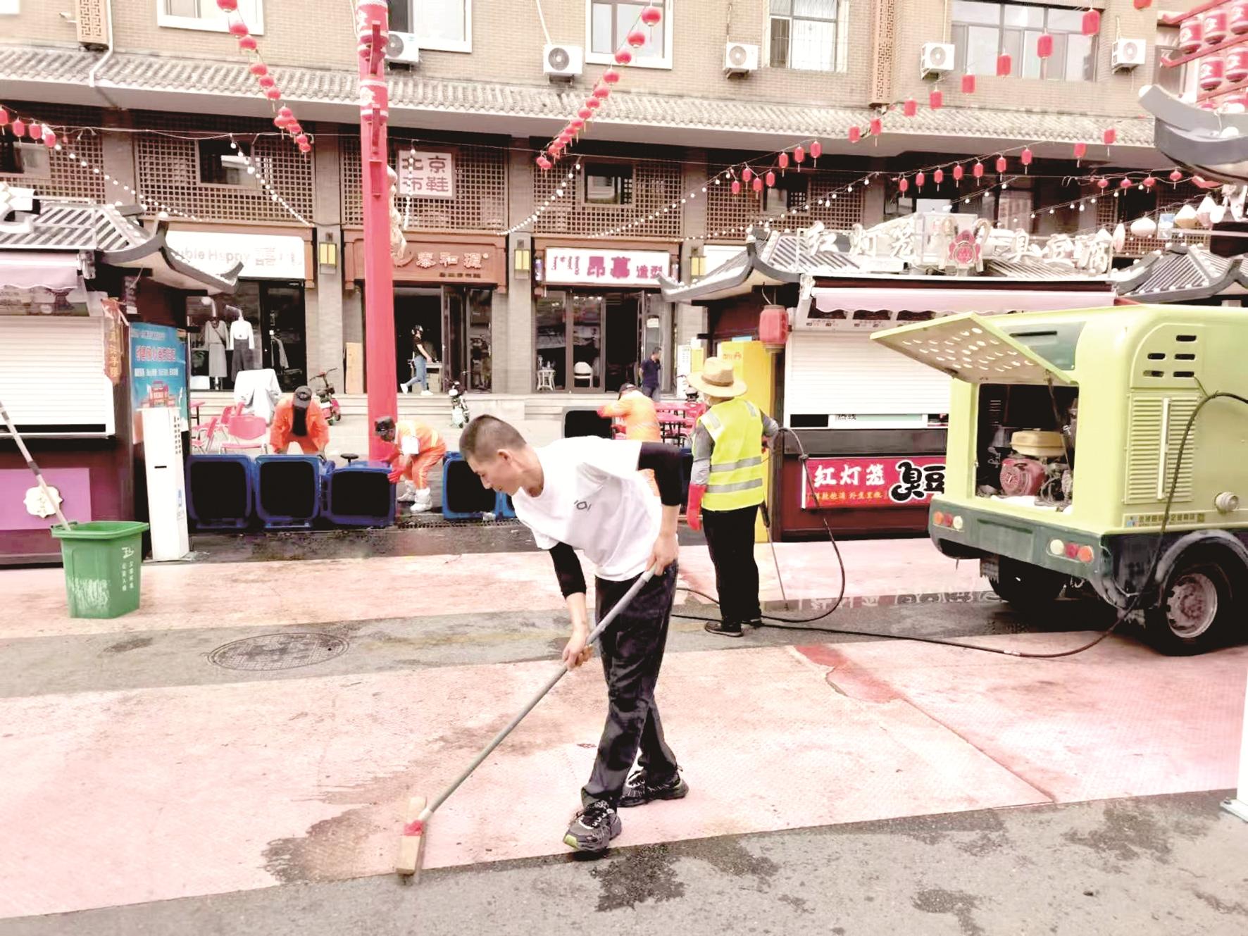 本报讯 为推动市容环境治理工作,提升美食街区的环境卫生水平,有效减少细菌滋生,近日,九原区城市管理综合执法局组织玉禾田公司工作人员23名、高压清洗车3辆对横竖街街区进行全方位清理。